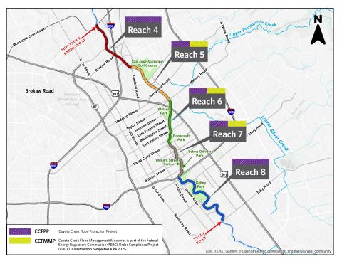 The Coyote Creek Flood Protection Project comprises two projects: the Coyote Creek Flood Management Measures for the FERC Order Compliance Project (CCFMMP or Phase 1) and the Coyote Creek Flood Protection Project (CCFPP or Phase 2). These phases cover a 9-mile stretch of Coyote Creek between Montague Expressway and Tully Road. This area is divided into several geographic segments known as reaches, which are shown on the map to the right.