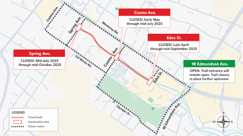Valley Water began construction in 2025 and is working through December 2025 to build new box culverts where West Little Llagas Creek crosses under Cosmo Avenue and Edes Street. This work requires a partial closure of Edes Street. For public safety, the West Little Llagas Creek Trail on the above-mentioned roads will also be closed.